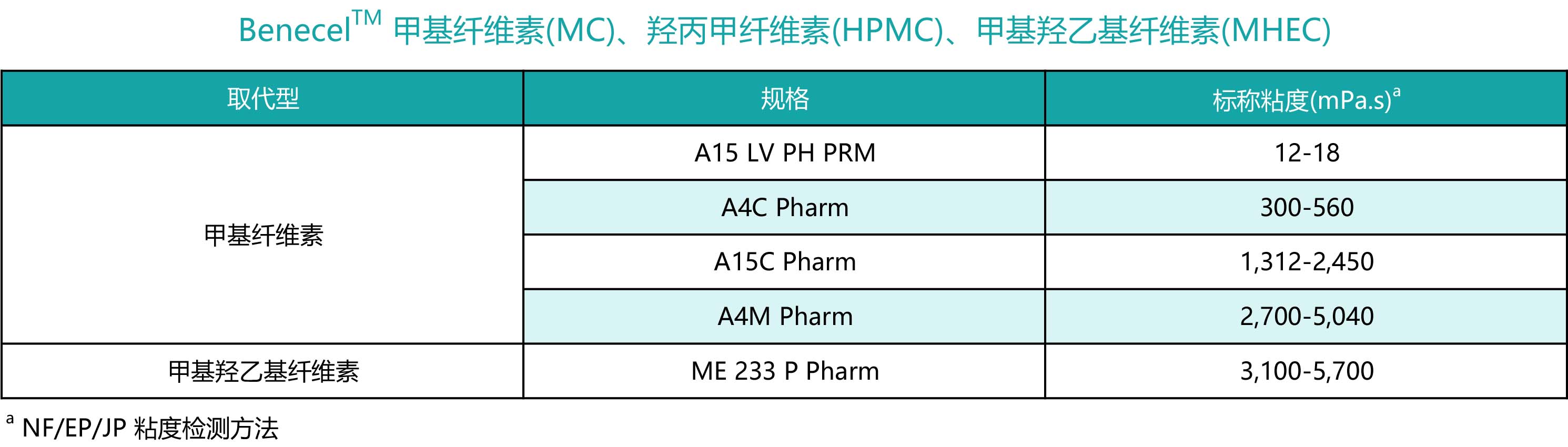 Benecel™ 系列产品根据粘度、取代度和应用需求有多种型号,例如: